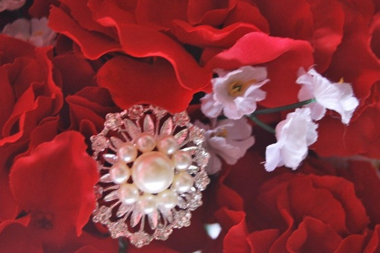 Pretty red rhododendron and white silk flowers with vintage and contemporary brooches.