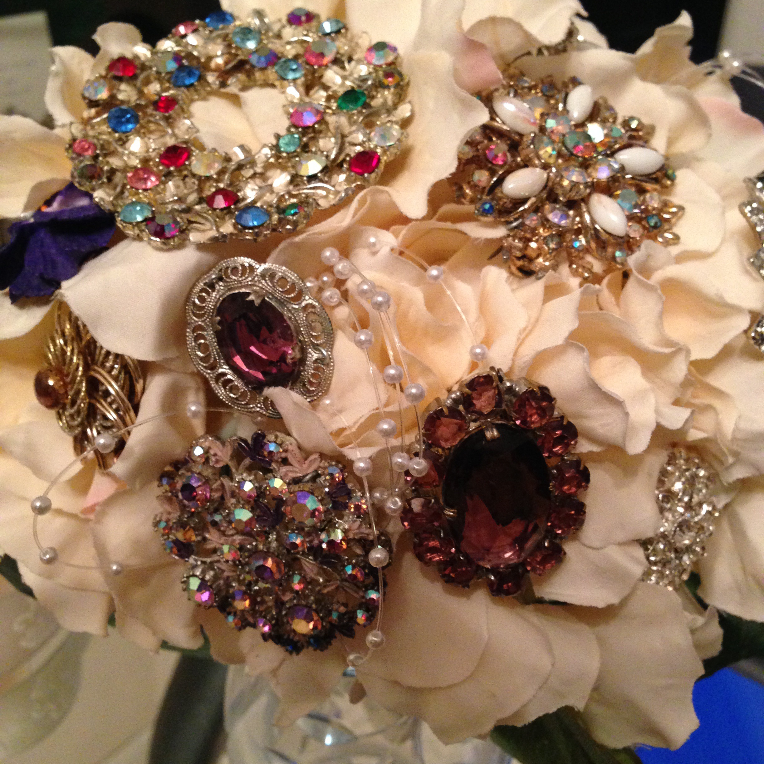 Packed with beautiful semi precious vintage brooches, and cream silk flowers. Butterflies and pearls with an ivory velvet handle.