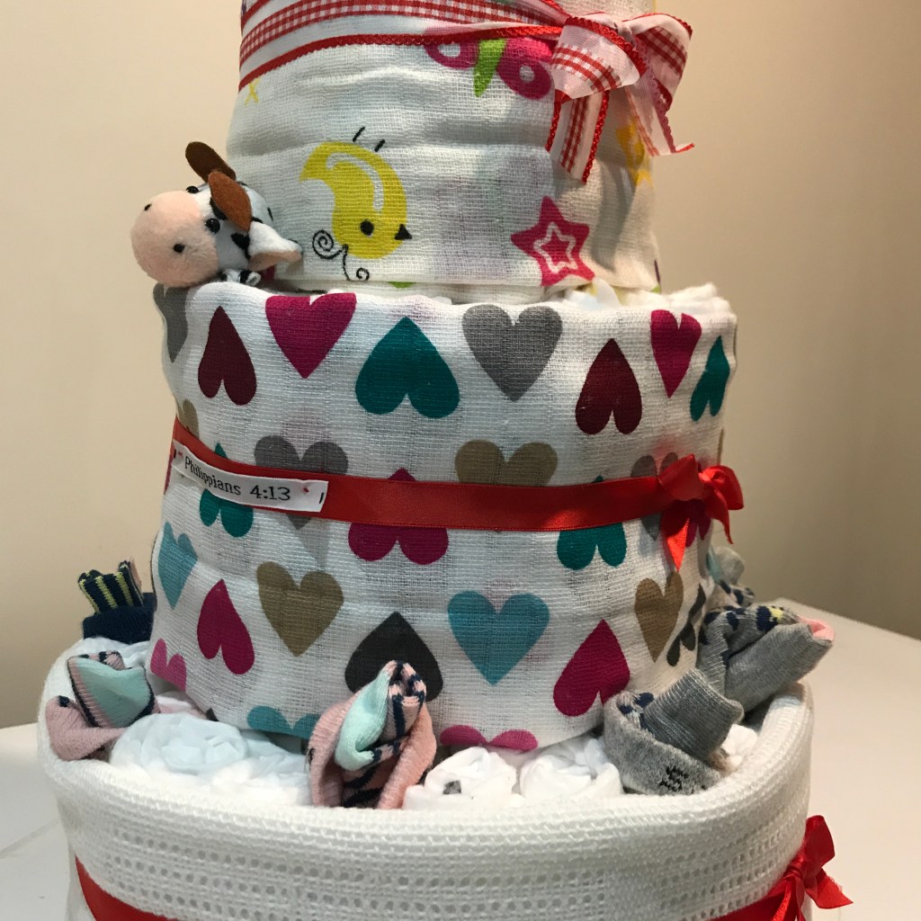 A cute and colourful Nappy Cake with over 60 nappies, Little Lamb Comforter, diddy socks, two muslins and a cellular blanket.