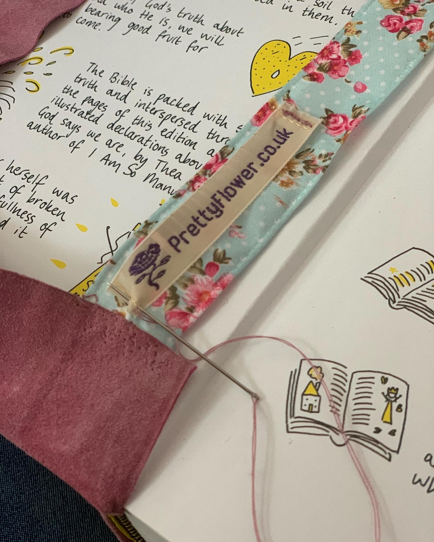 Pink suede, with a gorgeous blue elastic bind to stop my Bible falling open and getting damaged in my bag.
