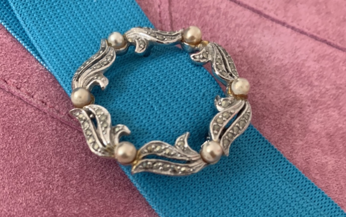I’ve sewn beading and pearls, a pretty butterfly. And adorned it with a pearl and marcasite brooch.