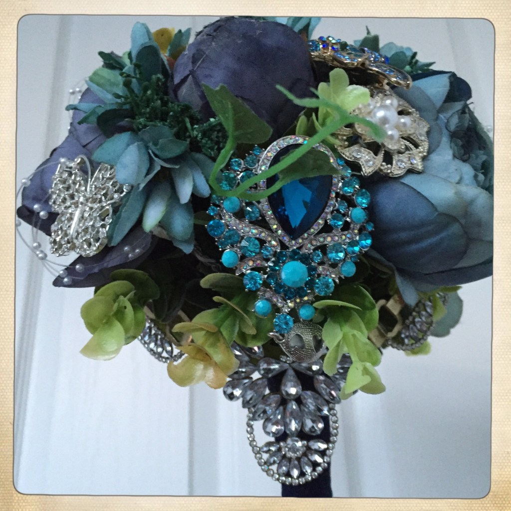Using silk flowers; roses, hydrangea and peonies arranged with vintage brooches, buttons and earrings. Rhinestone, diamante, ceramic, pearl and glass beads to create a one-off bouquet that you can keep forever.